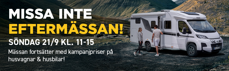 På söndag den 21/9 har vi eftermässa på Terminalvägen 1 i Löddeköpinge. Vi fortsätter succén från Elmia Husbil och Husvagnsmässa och kommer att ha kanonfina mässerbjudanden som man bara inte kan missa. Vi visar upp våra nya 2026 års modeller i så väl husvagnar som husbilar som precis rullat in.